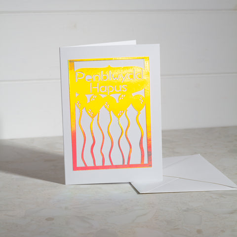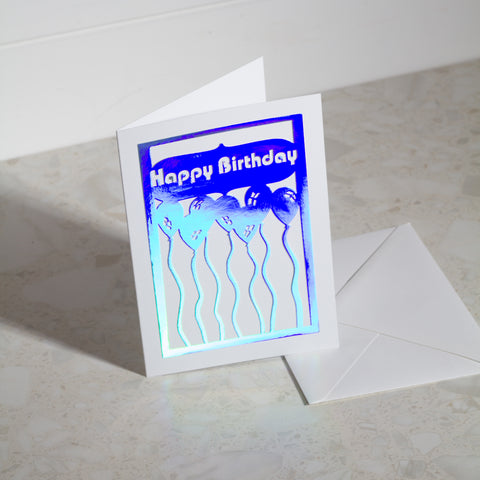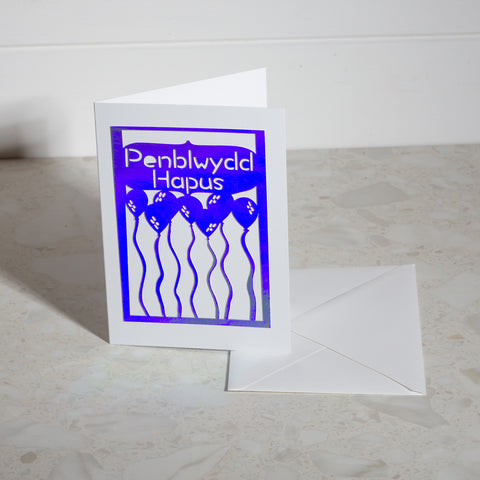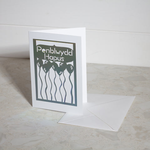 'Happy Birthday & 'Penblwydd Hapus' Holographic Paper Cut Greeting Card. Crafted from one sheet of Holographic card stock, the intricate design is mounted on sturdy 300gsm white card stock for a quality finish. Measuring 5x7 inches (12.5 x 17.5 cm), it’s perfect for sending a heartfelt message.