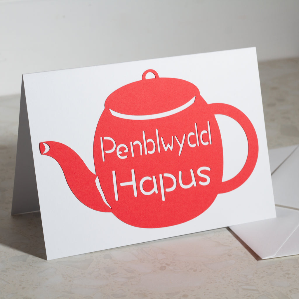 'Penblwydd Hapus' - Teapot Paper Cut Greeting Card. Crafted from one sheet of colored paper card, the intricate design is mounted on sturdy 300gsm white card stock for a quality finish. Measuring 5x7 inches (12.5 x 17.5 cm), it’s perfect for sending a heartfelt message.